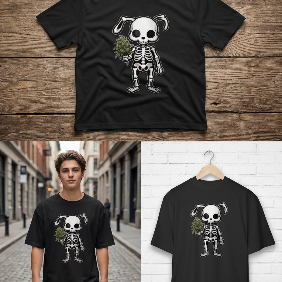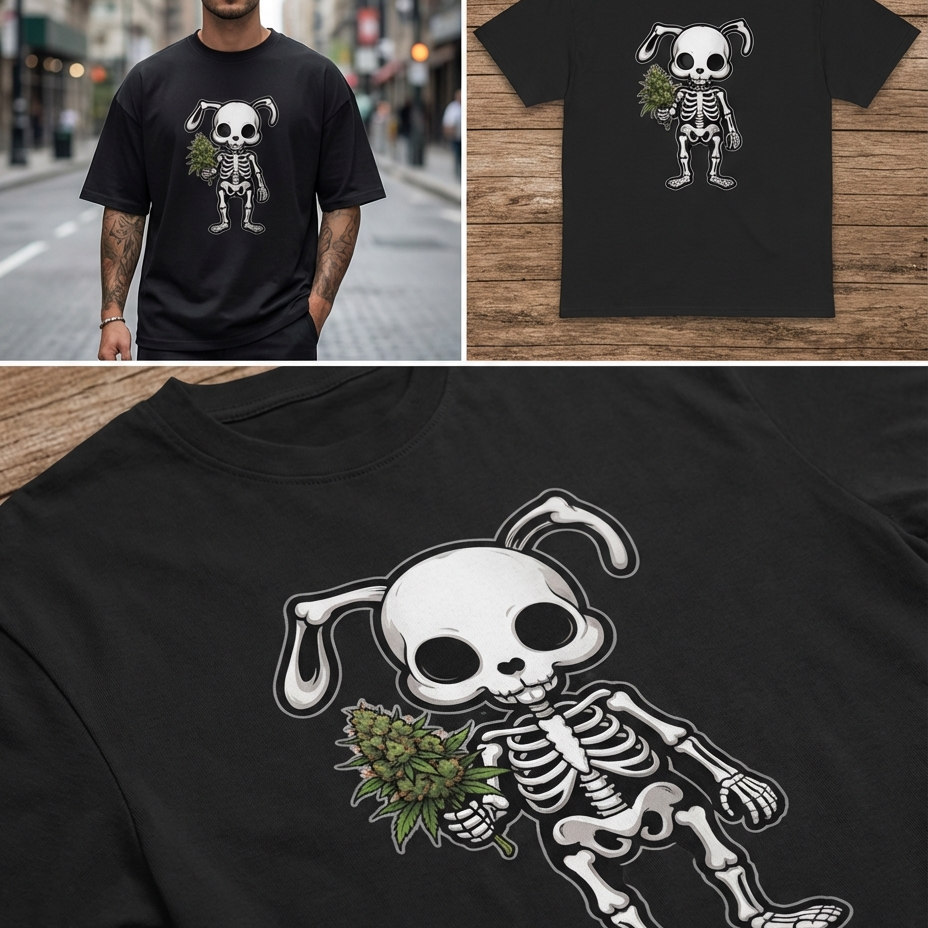 A arte mistura ironia, crítica e cultura de rua: o esqueleto representa o sistema seco, rígido, antigo; a cannabis surge como elemento orgânico, livre e consciente. É uma estampa que conversa com quem enxerga a rua como espaço de expressão, não só de passagem.