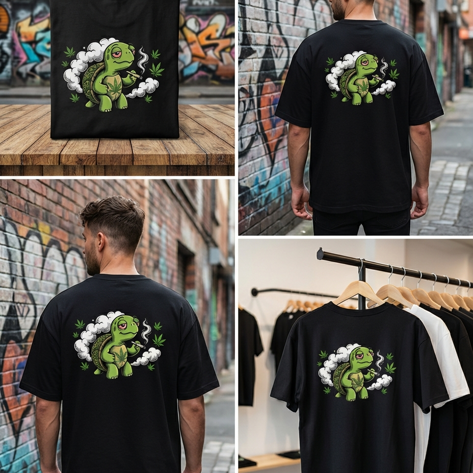 Minimalismo no tecido, atitude máxima na estampa. Esta oversize traz uma ilustração central que fala por si: uma tartaruga relaxada, expressão serena, cercada por folhas de cannabis e nuvens de fumaça — um símbolo de calma, resistência e liberdade. A escolha da tartaruga não é acaso: representa o tempo próprio, a vida sem pressa e a caminhada firme contra o caos.