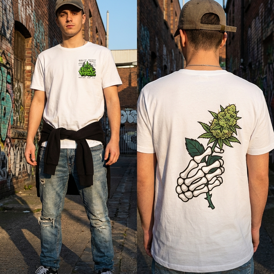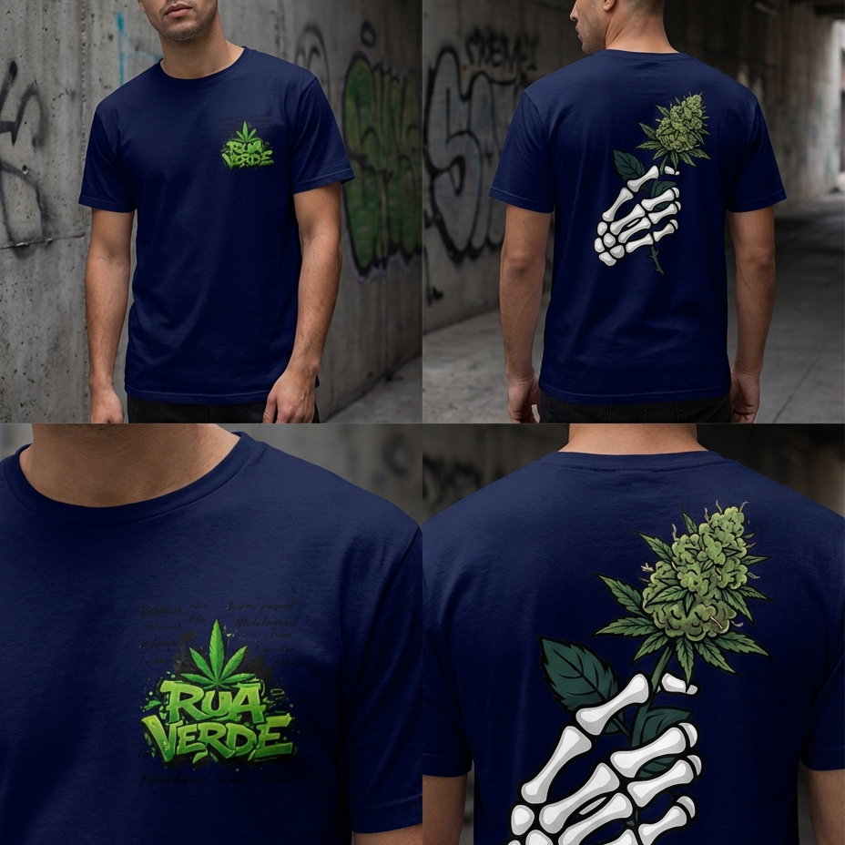 Minimalista à primeira vista, impactante no significado. A T-Shirt Quality Rua Verde carrega uma estampa forte e simbólica: uma mão em esqueleto segurando uma flor de cannabis, representando vida, resistência e a ideia de que a cultura segue florescendo mesmo diante da repressão. É arte urbana com mensagem — direta, consciente e atemporal.
